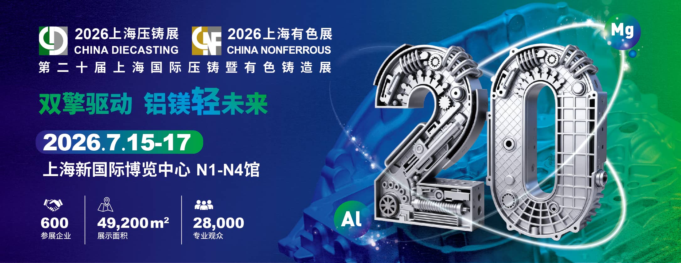 汽車與航空航天產(chǎn)業(yè)的持續(xù)升級,正為全球壓鑄與有色鑄造行業(yè)注入強(qiáng)勁動力。輕合金精密成形技術(shù)的突破,進(jìn)一步加速了應(yīng)用端的輕量化進(jìn)程。其中,鋁合金應(yīng)用持續(xù)深化與擴(kuò)容,鎂合金鋒芒初顯、加速滲透,共同構(gòu)成雙“引擎”驅(qū)動格局。與此同時,綠色低碳、智能化轉(zhuǎn)型與核心工藝創(chuàng)新,持續(xù)重塑產(chǎn)業(yè)生態(tài),已成為提升企業(yè)競爭力的關(guān)鍵要素。第二十屆上海國際壓鑄暨有色鑄造展(CHINA DIECASTING & CHINA NONFERROUS 2026)將于2026年7月15-17日在上海新國際博覽中心(N1-N4館)隆重舉辦。匯聚來自全球的壓鑄及有色鑄造全產(chǎn)業(yè)鏈企業(yè)與專業(yè)人士,集中展示新材料、新工藝、新應(yīng)用,深度聚焦智能制造、綠色低碳、模具創(chuàng)新等熱點(diǎn)方向。