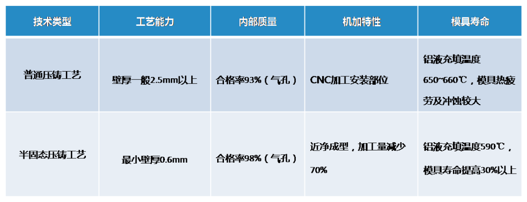 半固態(tài)成形關(guān)鍵技術(shù)在于一體化制漿工藝,形成性能獨(dú)特的半固態(tài)漿料,具有更好的流動(dòng)性能,更佳的微觀組織,可以成形大尺寸、薄壁、結(jié)構(gòu)復(fù)雜的輕量化鑄件,同時(shí),鑄件的熱裂、偏析、內(nèi)應(yīng)力大大減少,鑄件尺寸精度高。半固態(tài)壓鑄成形具有高精度、短流程、節(jié)能、節(jié)材等優(yōu)勢(shì)。
