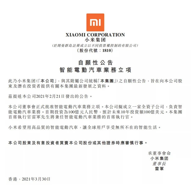 根據(jù)公告,小米將成立全資子公司,負(fù)責(zé)智能電動(dòng)汽車業(yè)務(wù)。首期投資100億元,預(yù)計(jì)未來(lái)10年將投資100億美元用于汽車項(xiàng)目。小米創(chuàng)始人、小米集團(tuán)董事長(zhǎng)兼首席執(zhí)行官雷軍將兼任智能電動(dòng)汽車業(yè)務(wù)的首席執(zhí)行官。而就在3月30日晚上舉辦的小米春季新品發(fā)布會(huì)上,雷軍宣布,小米正式進(jìn)軍智能電動(dòng)汽車行業(yè)。