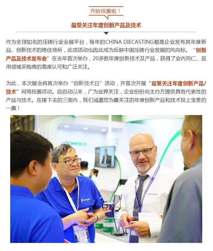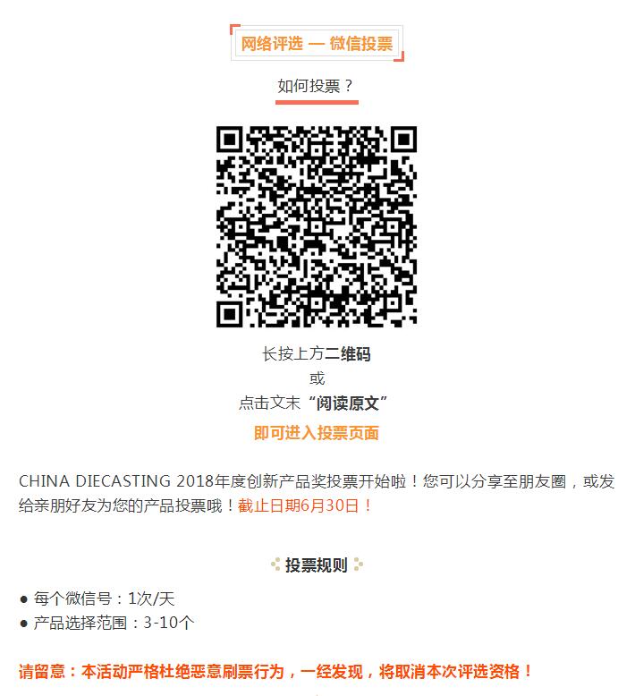 【投票】CHINA DIECASTING 2018中國(guó)壓鑄展:“最受關(guān)注年度創(chuàng)新產(chǎn)品及技術(shù)”網(wǎng)絡(luò)投票火熱進(jìn)行中!