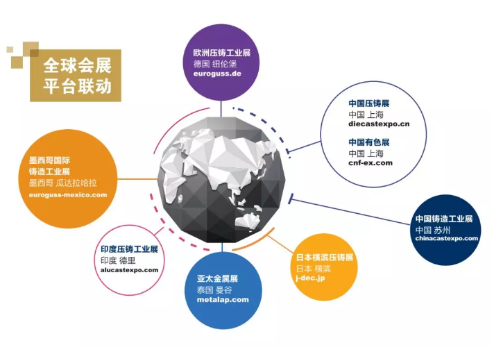 全球壓鑄聯(lián)動平臺(Global Die Casting Family)致力于為壓鑄行業(yè)打造專業(yè)化的全球展會聯(lián)動平臺。除了世界知名的EUROGUSS德國壓鑄工業(yè)展,先后連接中國、泰國、印度和墨西哥等全球主要壓鑄、鑄造產(chǎn)業(yè)國家和地區(qū)市場,基于展會形式服務(wù)壓鑄行業(yè),垂直深入行業(yè),了解行業(yè)前沿動態(tài),為中國壓鑄行業(yè)提供先進(jìn)的全球壓鑄市場和行業(yè)資訊,高質(zhì)量的全球參展參觀服務(wù)!