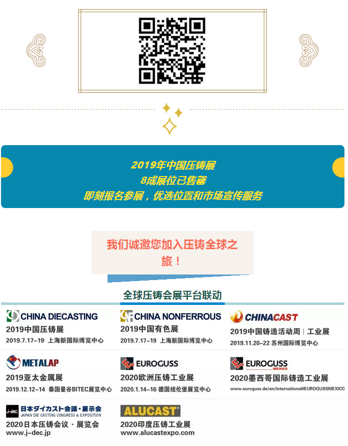 榮獲金獎(jiǎng)的鑄件將首次在2019年METAL AP 亞太金屬展(2019年12月12-14日·泰國(guó) 曼谷)和2020年EUROGUSS 德國(guó)壓鑄工業(yè)展(2020年1月14-16日·德國(guó) 紐倫堡)現(xiàn)場(chǎng)展出。走出國(guó)門(mén),在全球享有盛名的壓鑄展上展出金獎(jiǎng)風(fēng)采,促進(jìn)海內(nèi)外技術(shù)交流,吸引全球買(mǎi)家關(guān)注!