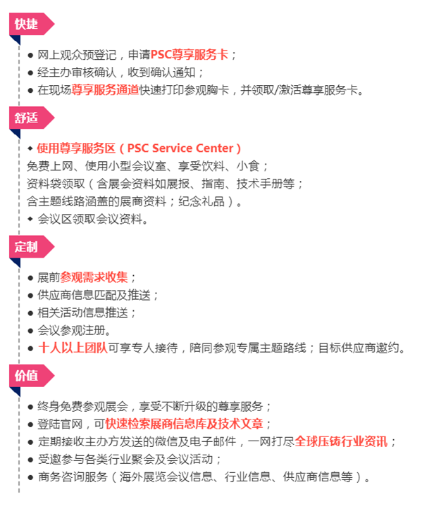 為了更高效地給展會(huì)觀眾帶來(lái)更多價(jià)值及更優(yōu)服務(wù),2019中國(guó)壓鑄展推出“尊享服務(wù)卡計(jì)劃”(Premium Service Card Plan),立足服務(wù),彰顯價(jià)值!
